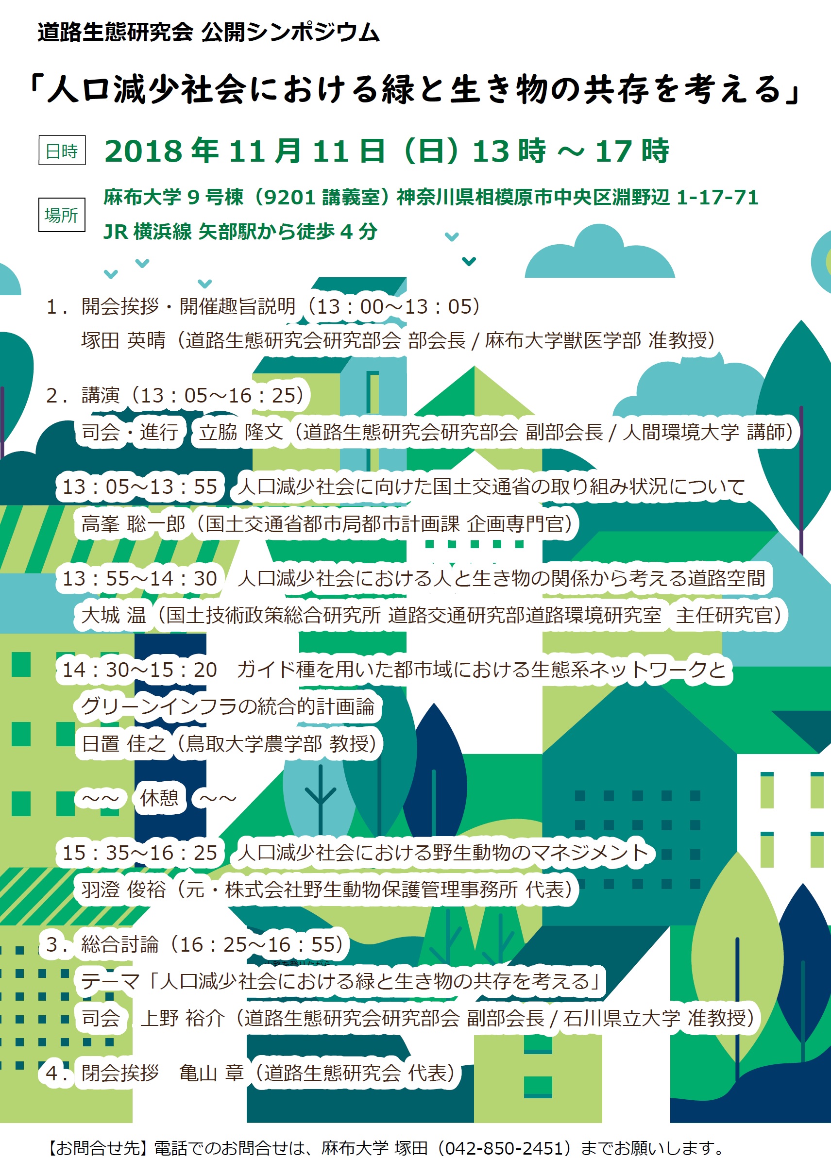 道路生態研究会では「人口減少社会における緑と生き物の共存を考える」をテーマに11月11日(日)に麻布大学でシンポジウムを開催します。詳細については、下記をご確認ください。参加自由(申込不要)ですので、興味のある方は奮って